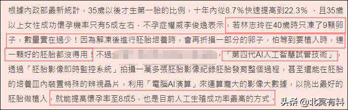 据传,林志玲在40岁之时雪卵9粒,某不孕症权威医生表示,林志玲雪卵的数量太少,解冻过程会有折损,有可能在植入阶段,连一颗完好的卵子都没得用。