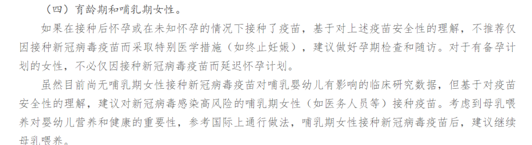 如果在接种后怀孕或在未知怀孕的情况下接种了疫苗,基于对上述疫苗安全性的理解,不推荐仅因接种新冠病毒疫苗而采取特别医学措施(如终止妊娠),建议做好孕期检查和随访。