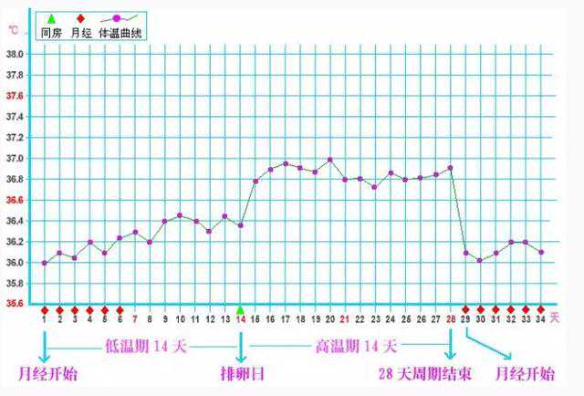 体温调节中枢对孕酮(又称黄体激素)作用极为敏感,一定量的孕酮(12.8毫摩尔/升)即可引起体温升高。正常情况下,从月经开始那一天,到排卵的那一天,因孕激素水平较低,一直处于低体温,一般为36~36.5℃;排卵后,卵泡分泌孕激素,基础体温上升到高温段,一般在36.8℃左右。从低温段到高温段的几日,可视为排卵日,这期间过性生活则容易受孕。