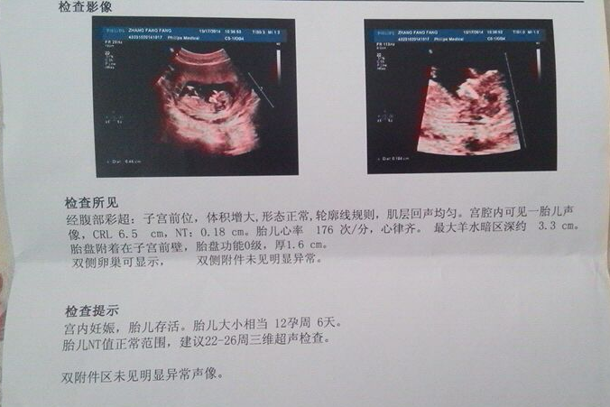 7周去医院检查,但是孕酮低,吃了一周孕酮片复查基本没长,开始了为期42天打黄体酮的日子。一直打到12周整去做NT,才停针。NT时已经成型。16周唐筛结果临界风险,又做的无创,唐筛结果输入宝宝显示男孩。