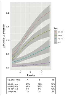 丹麦奥尔胡斯大学医院生殖中心统计了他们中心2000年1月至2013年12月期间4570个周期38岁以上常规方案试管婴儿的女性,发现随着年龄的增加,超过38岁时,常规IVF方案所需的促排卵药越来越多,周期取消率越来越高,累计活产率及获卵数显著下降(分别为8个±6.7,7.2个±6.2,5.5个±5.4,4个±4.4枚卵子)而流产率显著升高;累积活产率38~39岁组为25.9%,40~41岁组降至16.4%,42~43岁组及44岁以上仅有7%和1.2%。41岁以下女性,累计活产率与取卵数目正相关,超过41岁以上相关性不显著,超过44岁者获卵数增多与累计活产率获益无关,累积活产率只有1%~2%(见下图):