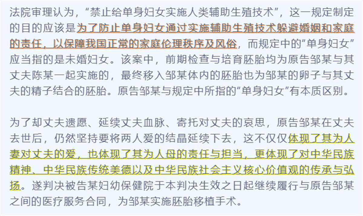 可见,这场官司与其说是维权的官司,不如说是普法的官司。法院的判决明确表示,虽然《人类辅助技术规范》规定,禁止给不符合国家人口和计划生育法规和条例规定的夫妇和单身妇女实施人类辅助生殖技术,但该案件的原告属于丧偶的单身妇女,与法律规定的意义完全不同。妻子在配偶去世后仍愿意孕育后代,情意感人,担当可贵,应该予以支持。这样的判例,无疑是为妇女生育权撑了腰,也为同类案件的审理提供了良好示范。