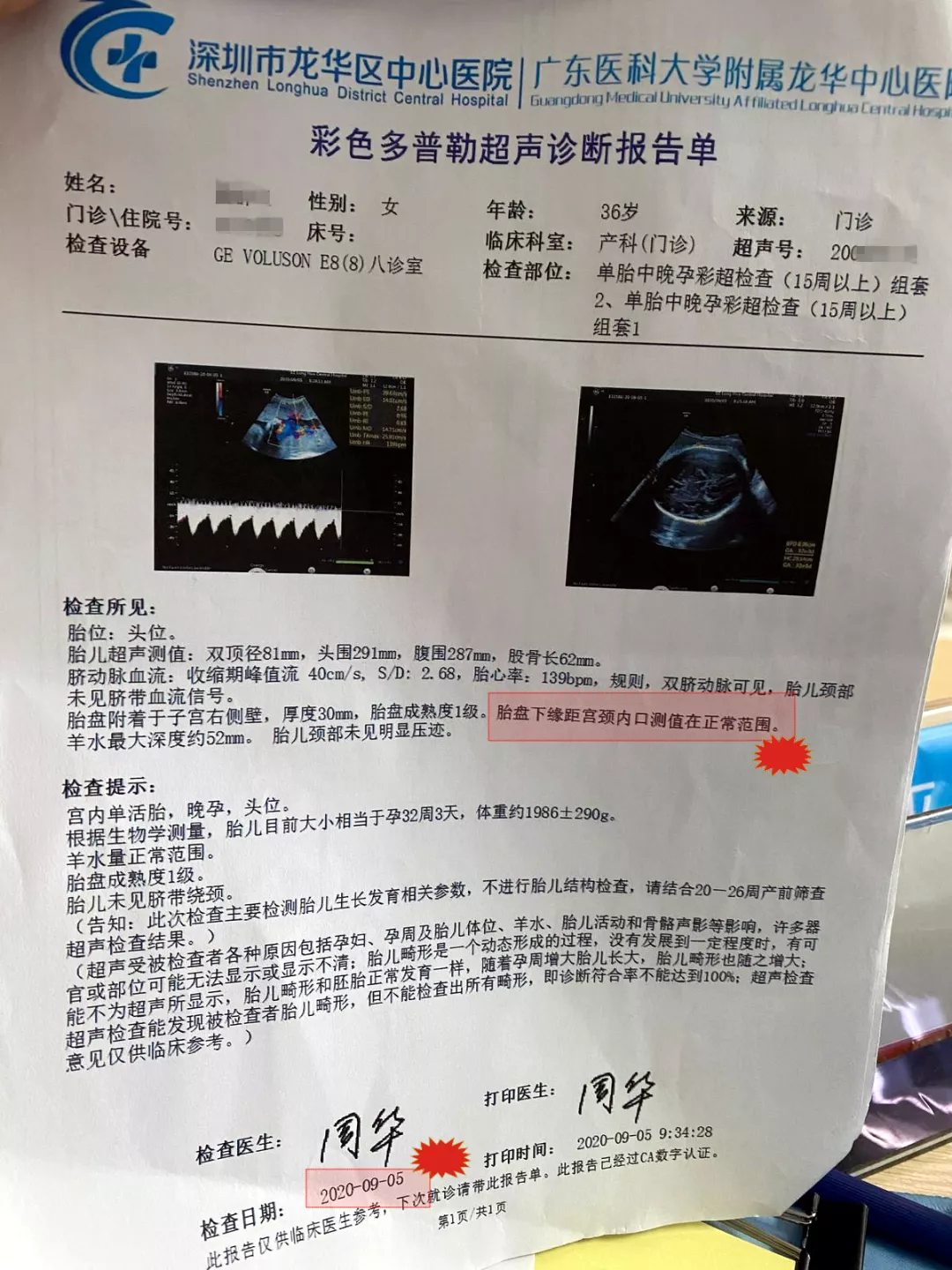 2020年9月28日,在怀孕35周+4时,因阴道有少量褐色分泌物,黄女士去产科就诊。我发现她当日看了两位产科医生,没做阴道检查,没做彩超检查,我问她,为什么不做?她回复我说:她想做,但产科医生说没必要做。我明确地告诉她:“这个检查必须做,我不给你开单子,我可以给你联系彩超医生,我会跟彩超医生交代好你的病情,以及你的宝宝来之不易的这份珍贵”。最后,当她做完彩超,结果出来:完全性前置胎盘,立刻收住入院。